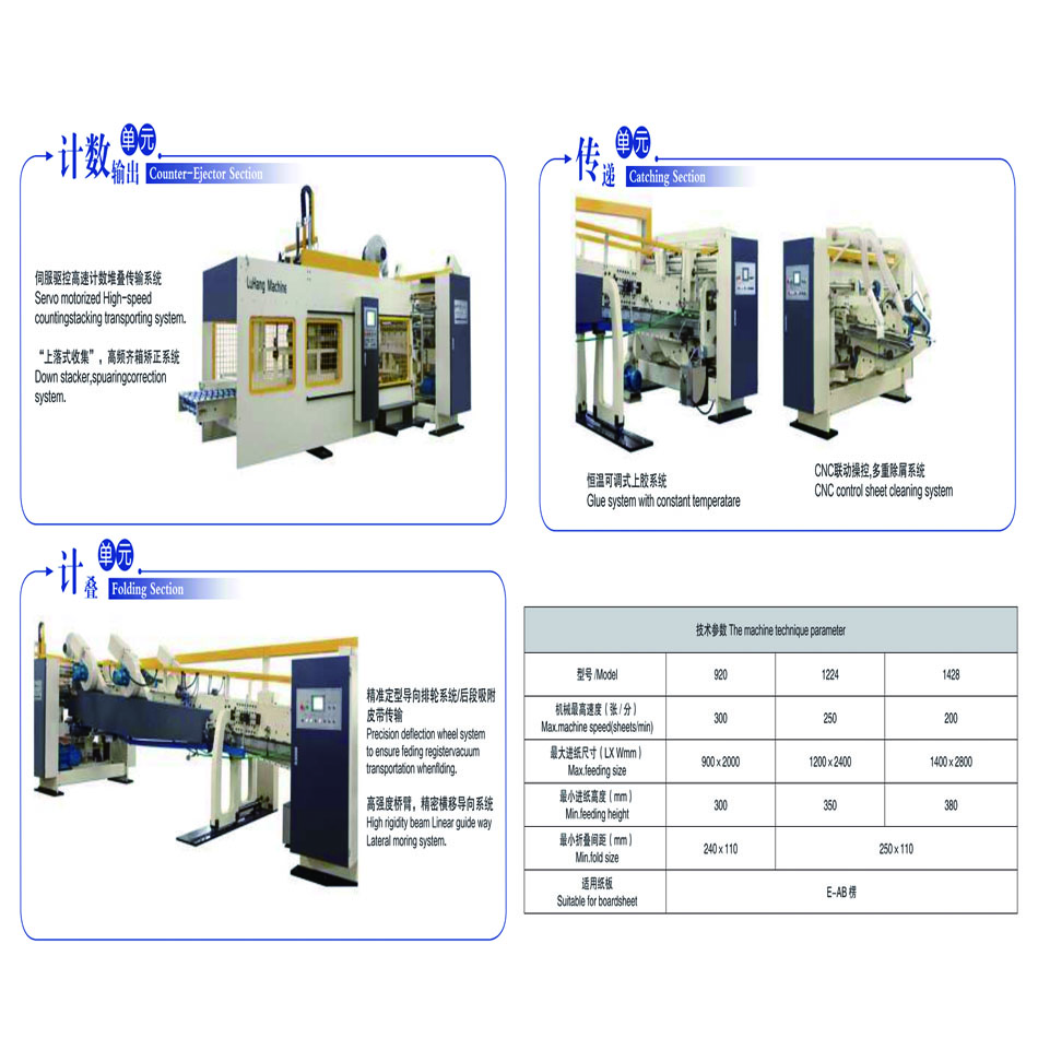 The gluer machine handles both flat and special-shaped boxes, featuring our original front positioning and dual-use specifications.